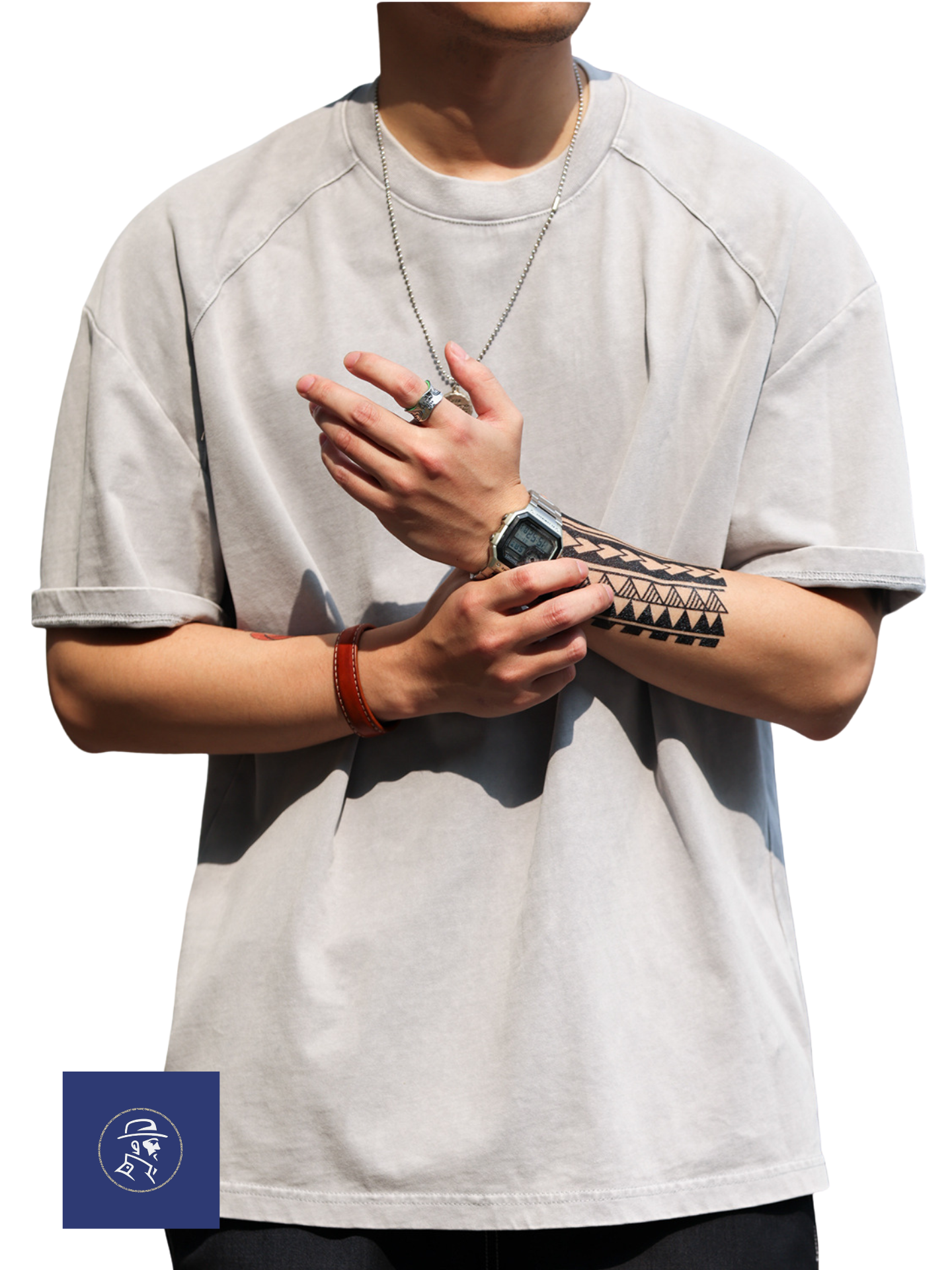 しっかりとした280gのヘビーウェイト生地を使用し、洗いをかけた風合いがレトロで味わい深い印象を与えます。ラグランスリーブならではのリラックス感と動きやすさに加え、ゆったりとしたルーズシルエットが旬のストリートスタイルにもマッチ。